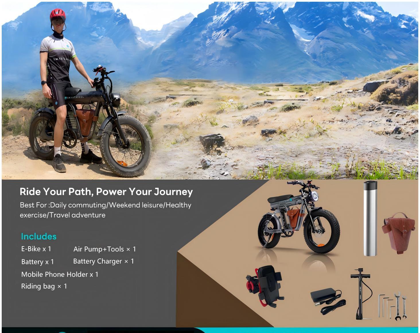 - Long‑Range Performance Removable 48 V 20 Ah lithium‑ion battery provides 40+ miles in throttle‑only mode or 80+ miles with pedal assist. Advanced 12‑channel BMS ensures reliable power delivery and extended battery life.