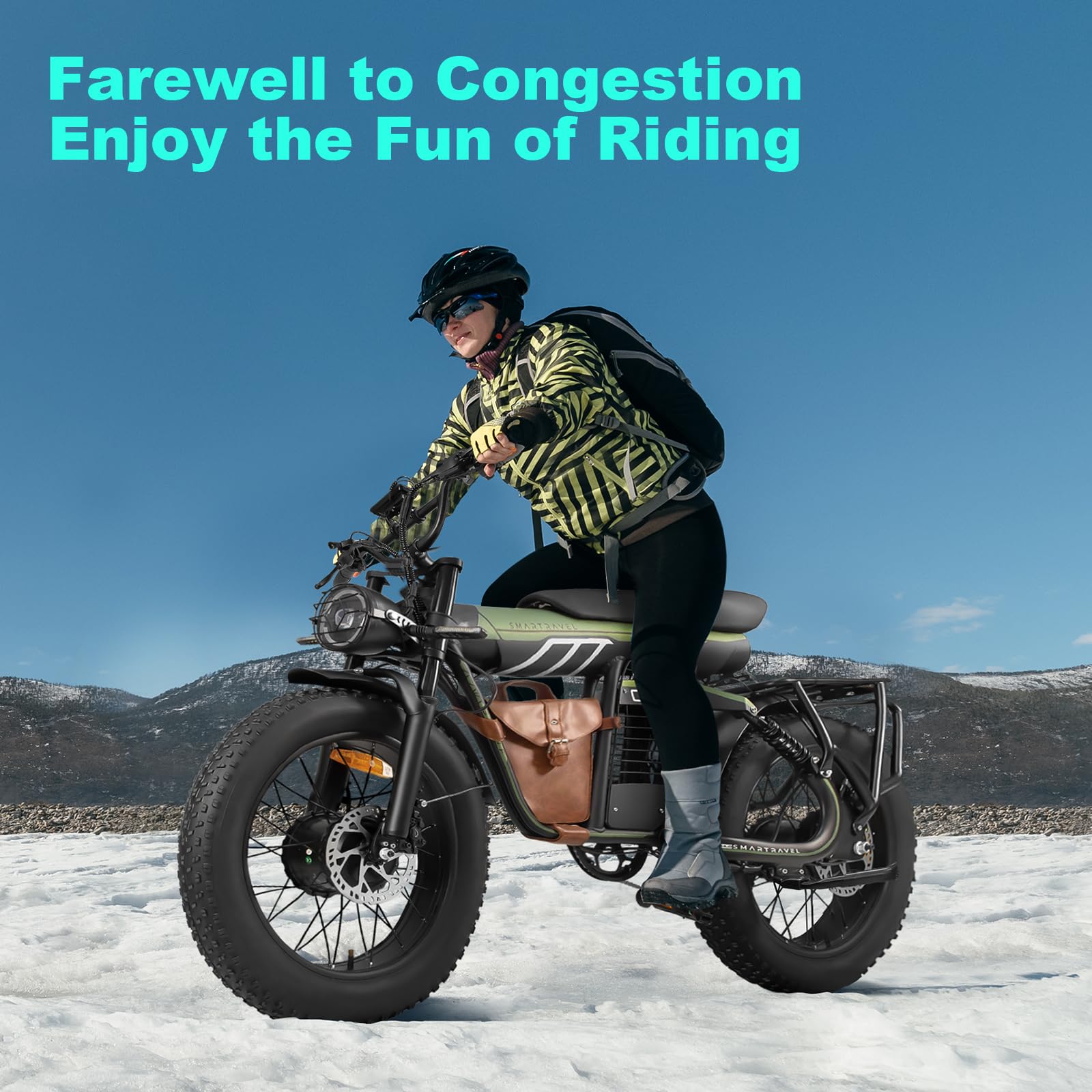 - Powerful Drive System 1250 W(500W front + 750W rear) dual brushless hub motor delivers 80 Nm torque and reaches up to 40 MPH—ideal for tackling hills, headwinds, and heavy loads.Long‑Range Performance Removable 52 V 20.8 Ah lithium‑ion battery provides 40+ miles in throttle‑only mode or 80+ miles with pedal assist. Advanced 12‑channel BMS ensures reliable power delivery and extended battery life.Multi‑Terrain Ready 20"×4.0" fat tires deliver exceptional grip on sand, snow, gravel, and wet surfaces. Full dual suspension (front fork + rear shock) smooths out bumps for a comfortable ride.Advanced Safety System Dual hydraulic disc brakes offer fast, stable stopping in all conditions. Full 360° LED lighting setup (headlight, taillight, turn signals) keeps you visible day or night.Smart & Intuitive Controls IPX5 water‑resistant LCD display shows speed, battery level, mode, and distance at a glance. 7‑speed trigger shifter lets you fine‑tune power assist on the fly.Ready‑to‑Ride & Compliance Certified 90% pre‑assembled—attach pedals, handlebars, and front wheel in minutes. UL 2849 certified for electrical safety. Regulatory Notice: Class 3 e‑bike (up to 40 MPH) may be restricted for road use in some states—please verify local regulations before purchase.Thoughtful Accessories Included Comes with phone holder, multi‑tool kit, air pump, and saddle bag. Lightweight yet robust aluminum alloy frame supports up to 350 lbs.