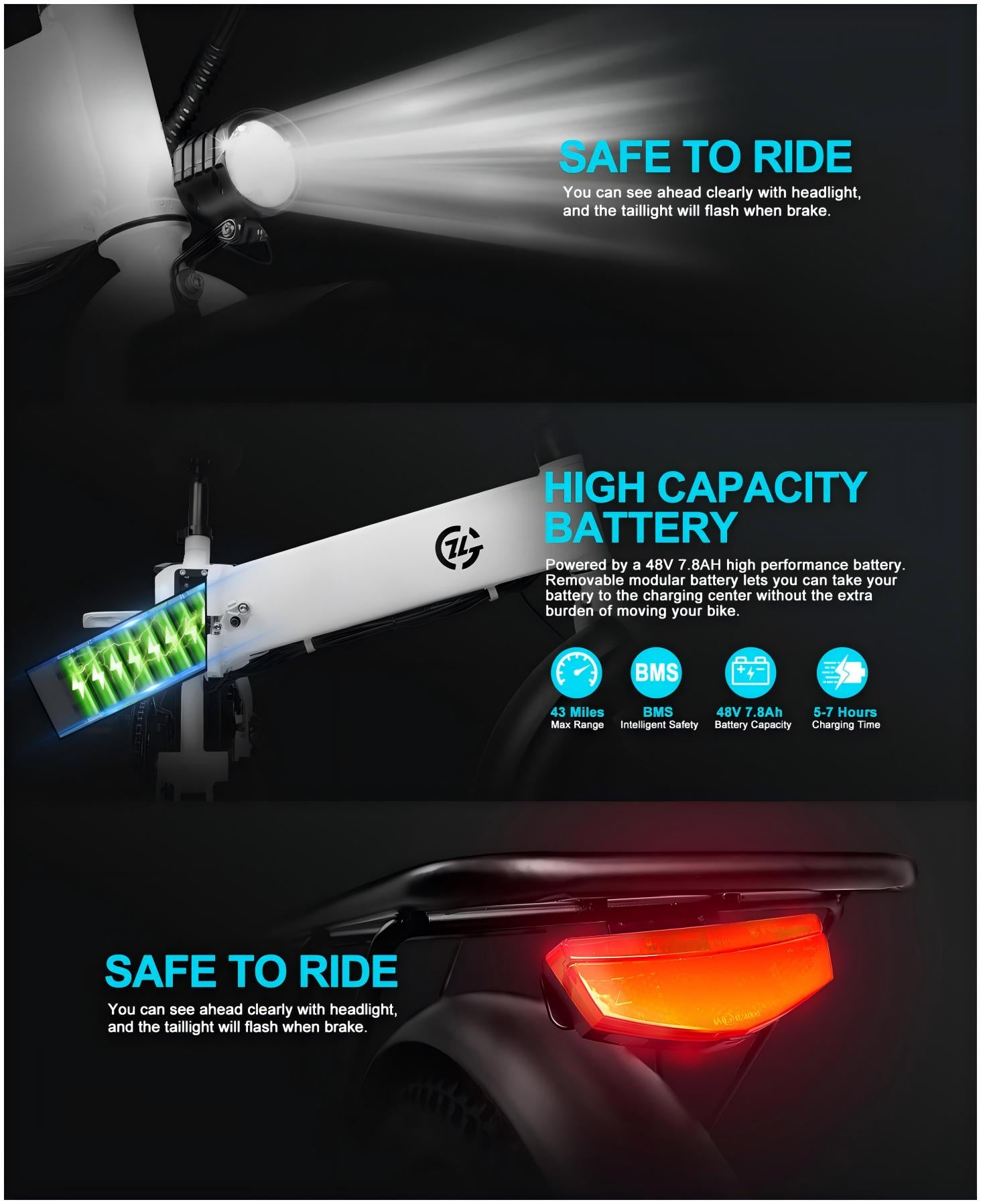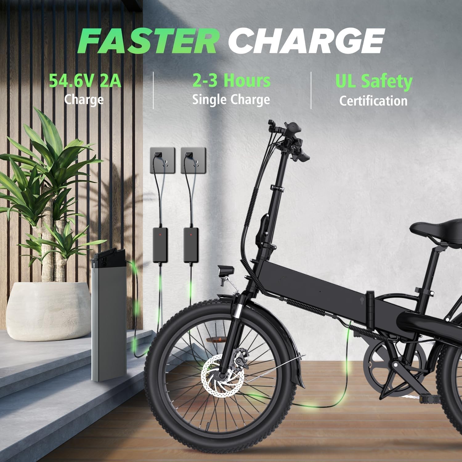 - Long-Range Efficiency — 48V 10Ah removable battery achieves 50-mile PAS range. 54.6V/2A charger refills in 2-3 hours. UL 2849 certified.