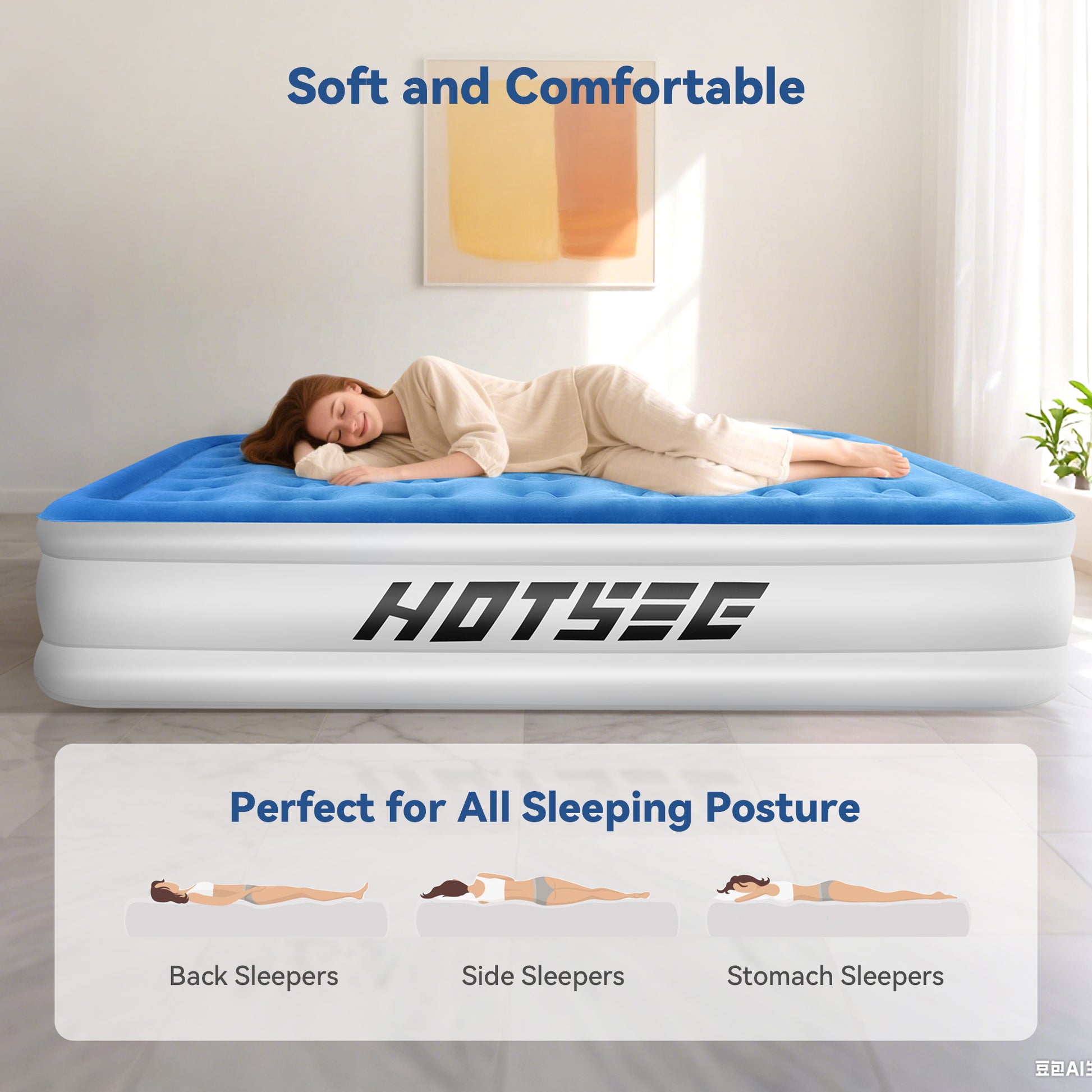Hotsee Queen Air Mattress with Wireless Built-in Pump and Raised Pillow, Blue