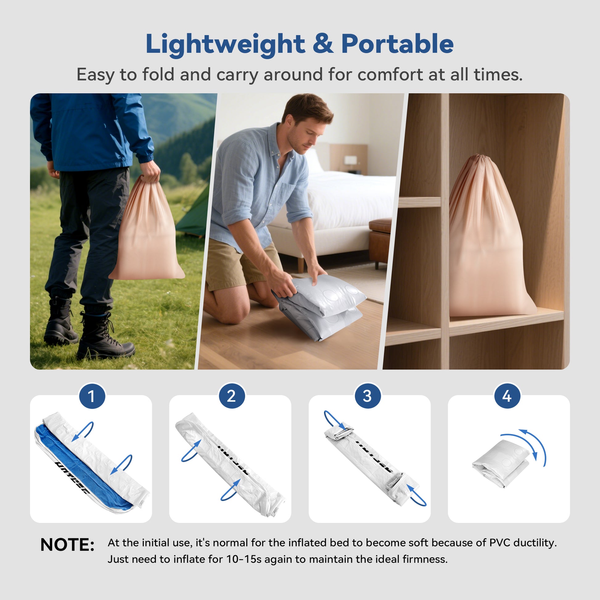 Material Naturally Stretches – A slight loss of pressure after initial inflation is normal as the material stretches. Simply re-inflate as needed; the mattress will fully settle within 2–3 nights.
