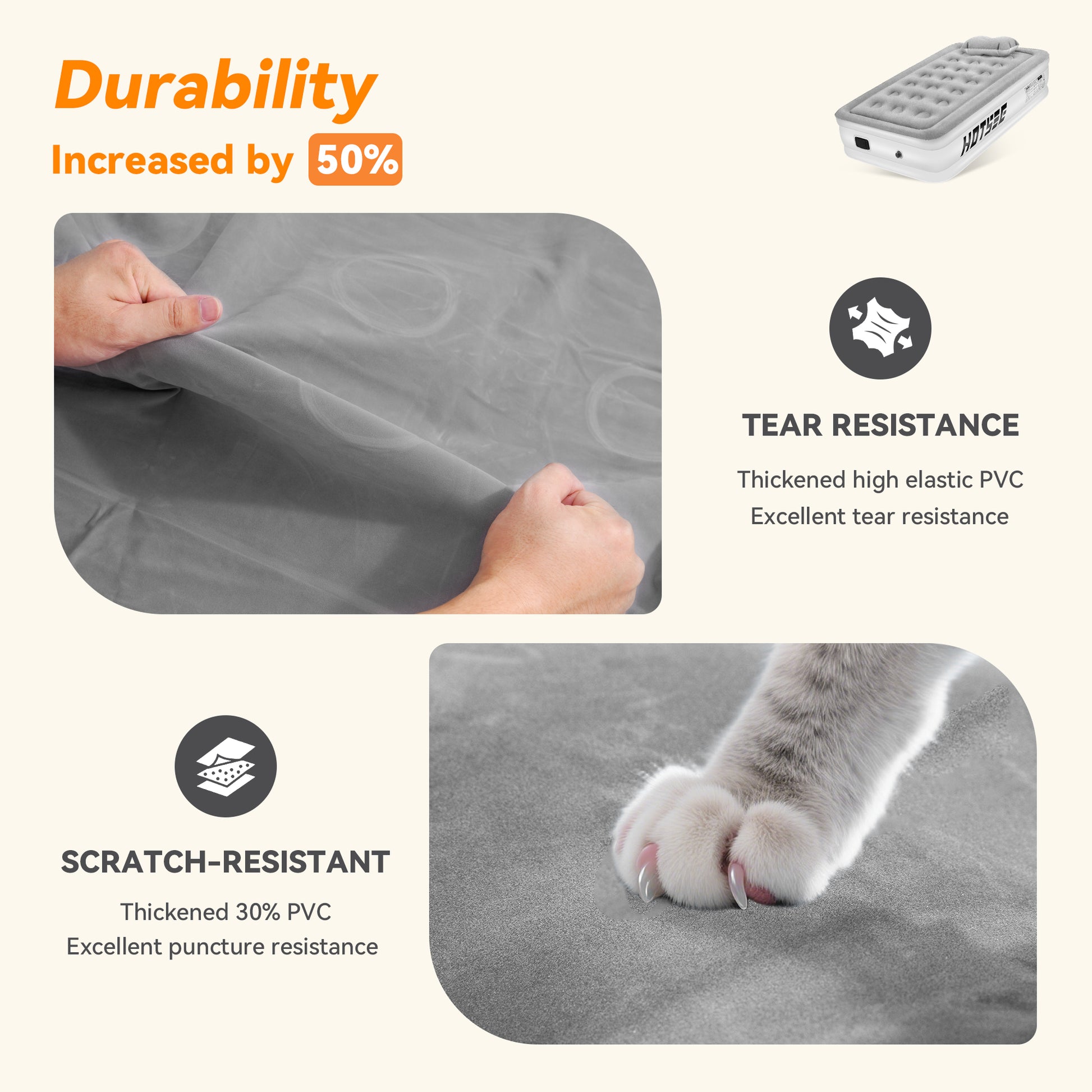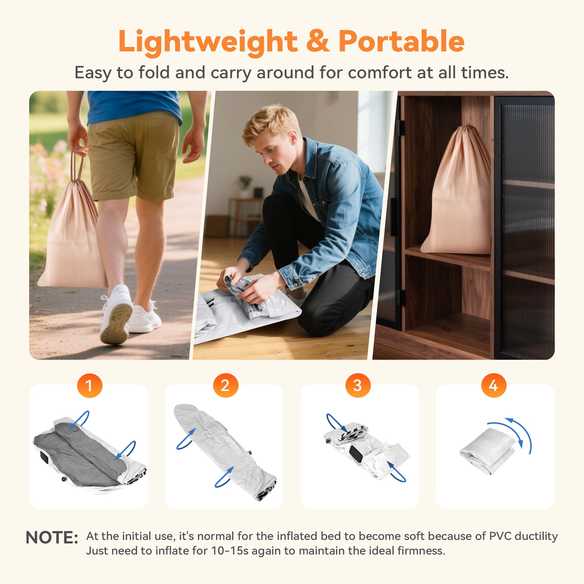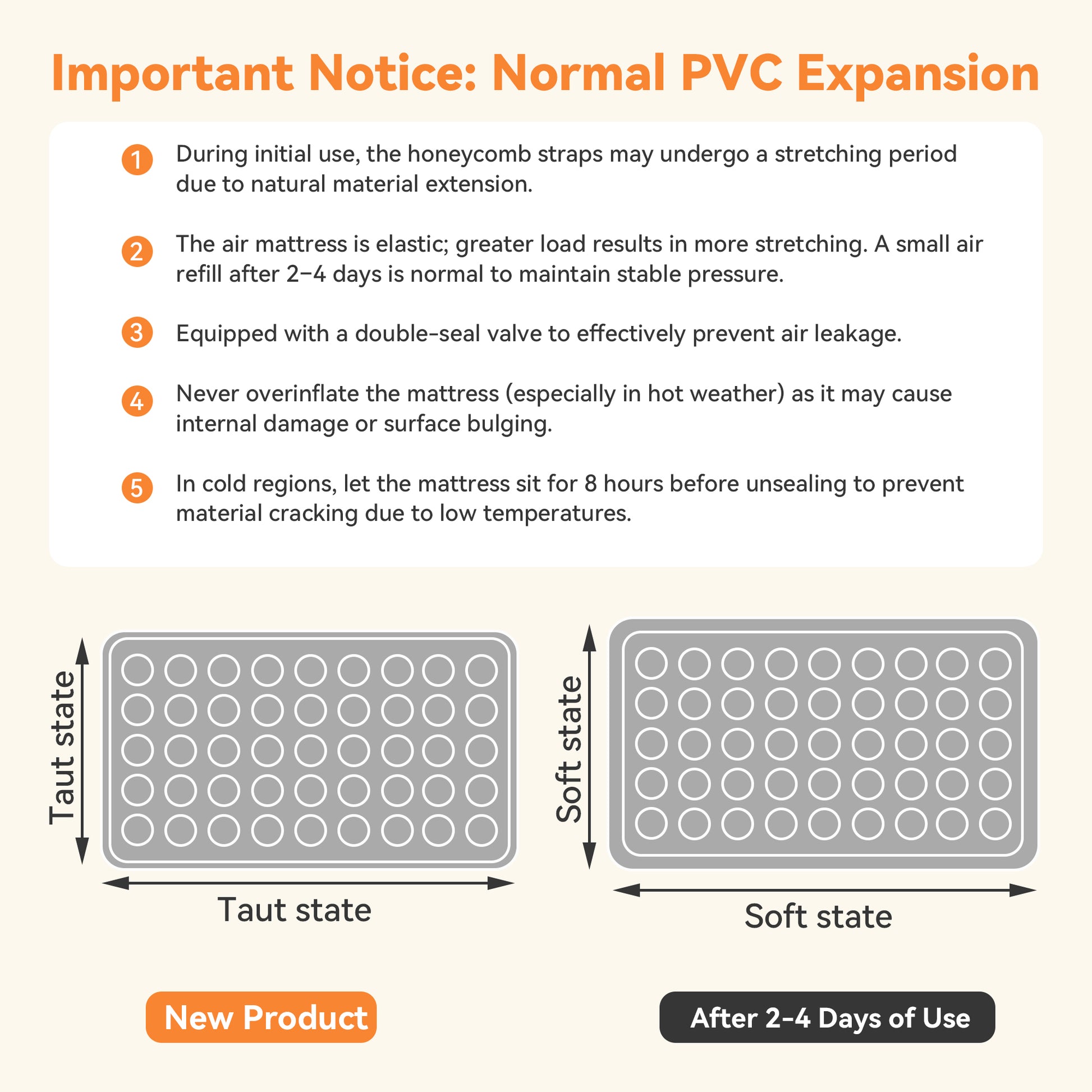 Material Naturally Stretches – A slight loss of pressure after initial inflation is normal as the material stretches. Simply re-inflate as needed; the mattress will fully settle within 2–3 nights.