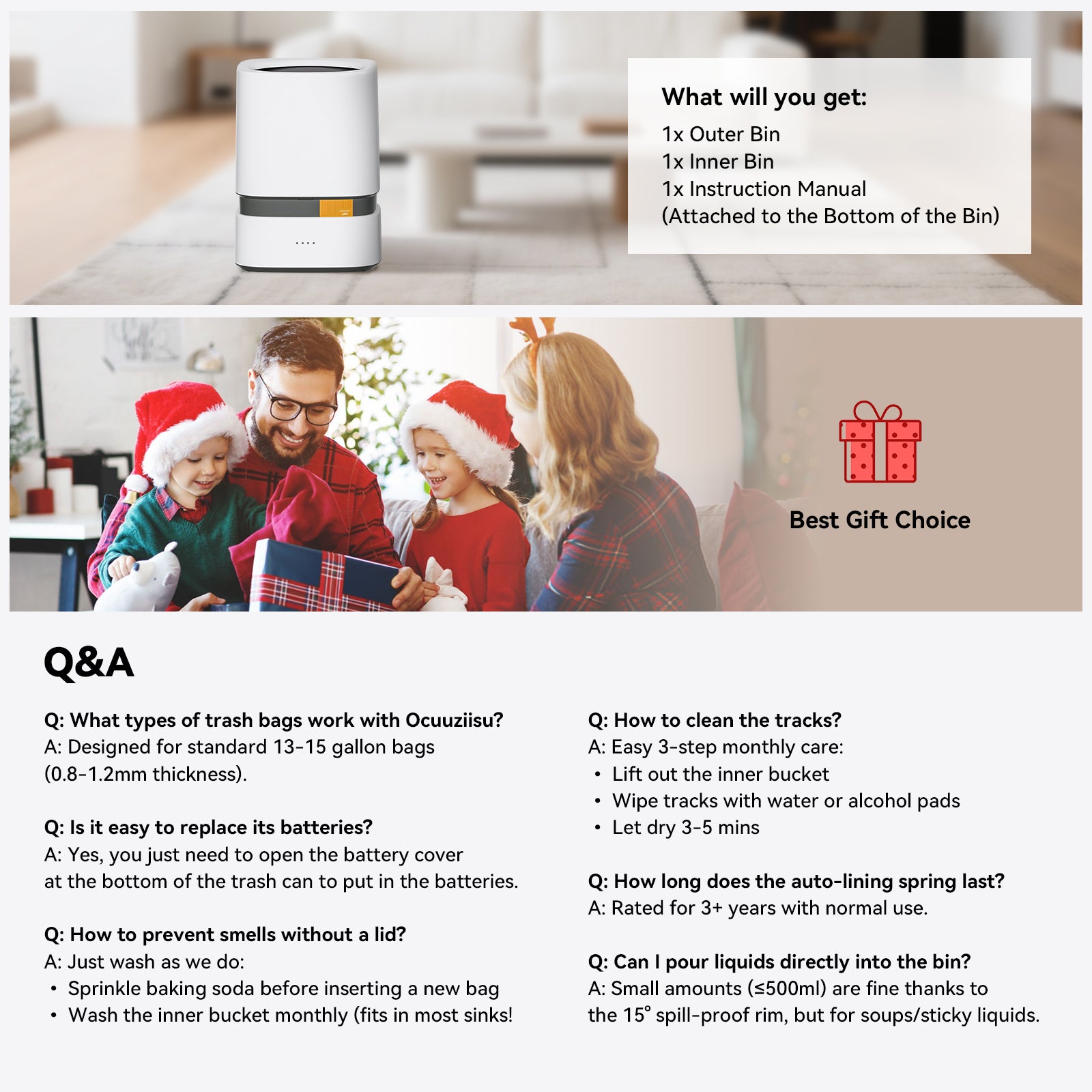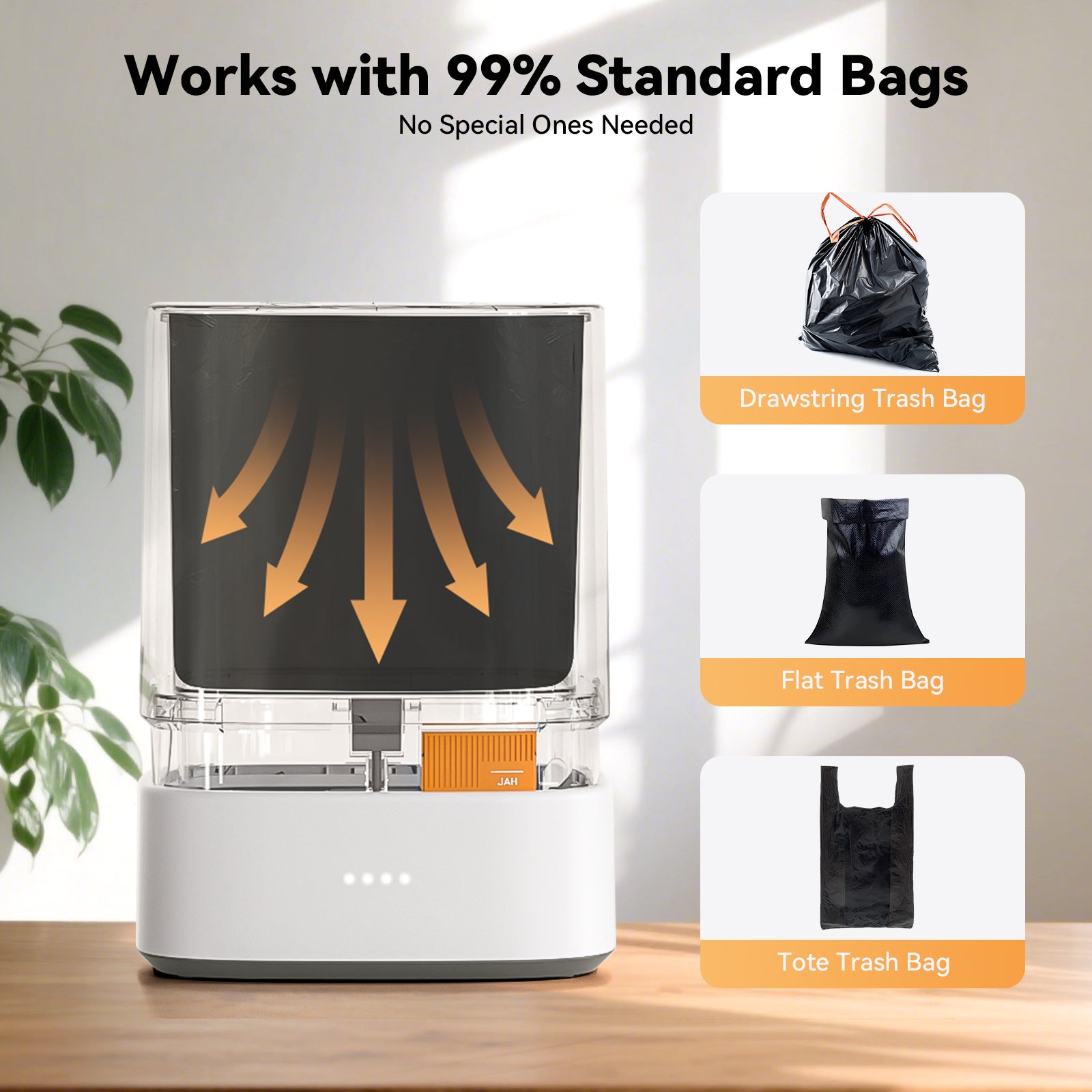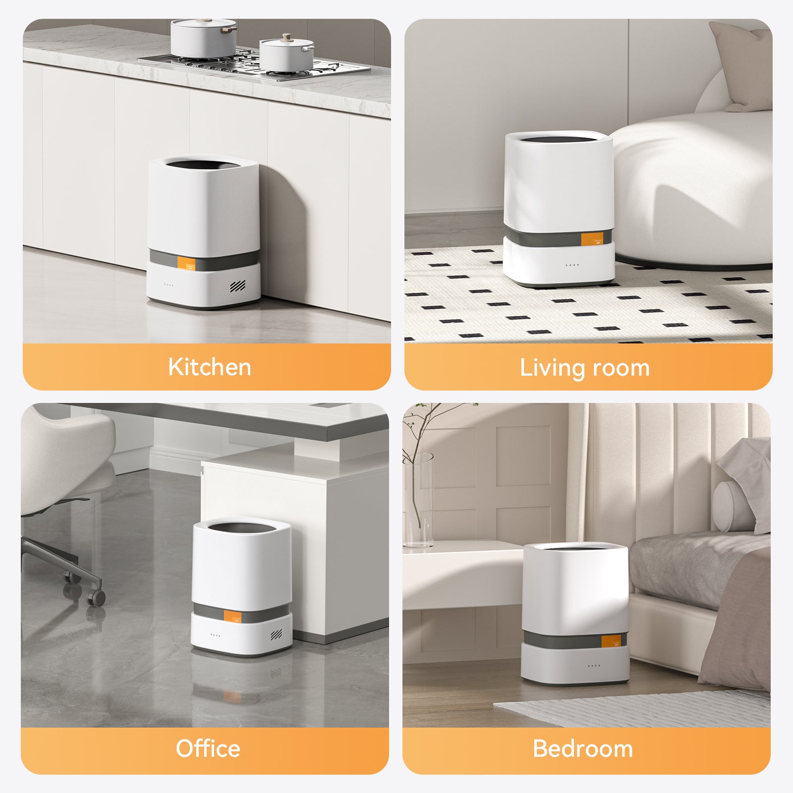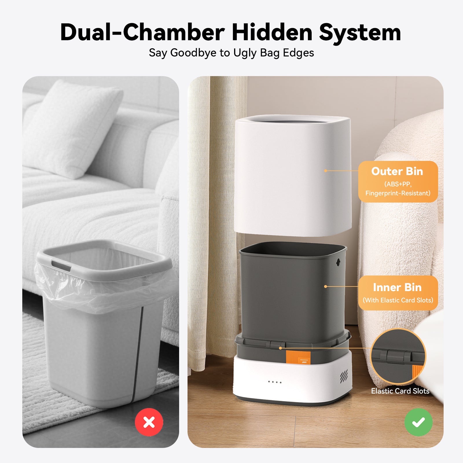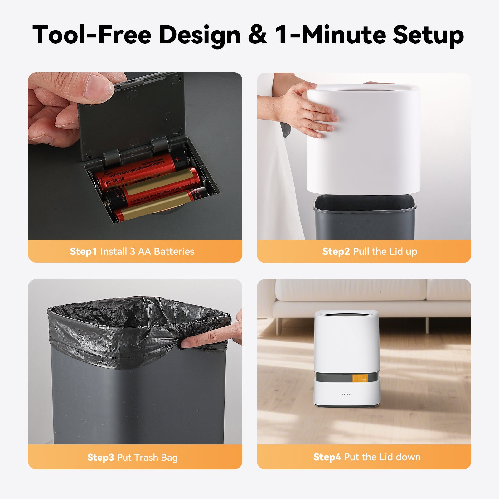Automatic Adsorption Trash Bin -- Experience the convenient operation of the smart adsorption technology! After putting down the outer bucket, the built-in suction system immediately fixes the new garbage bag, efficient and labor-saving. (Powered by 2 AA batteries, batteries not included).